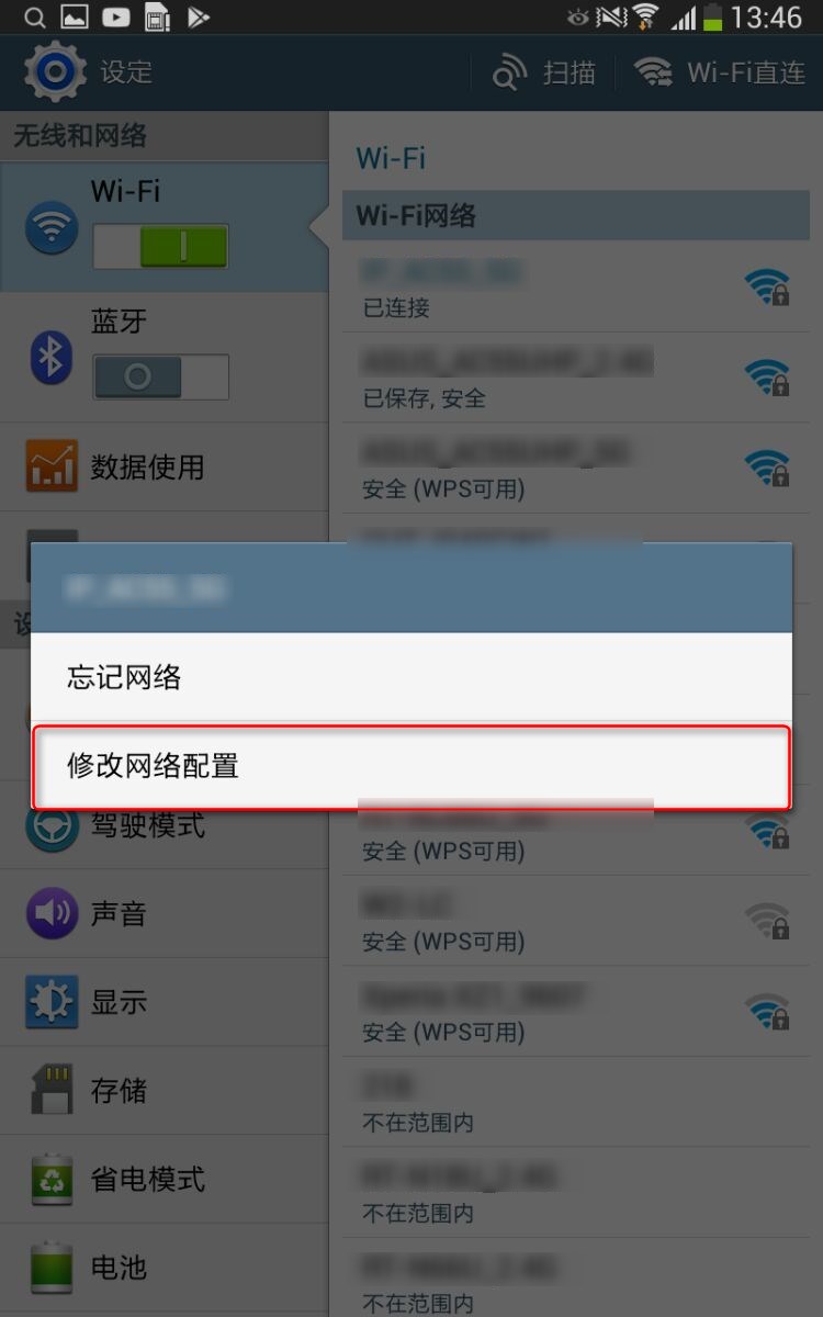 3. 在 Wi-Fi 列表选择已连接的 Wi-Fi 名称, 长按之后选择 “ 修改网络