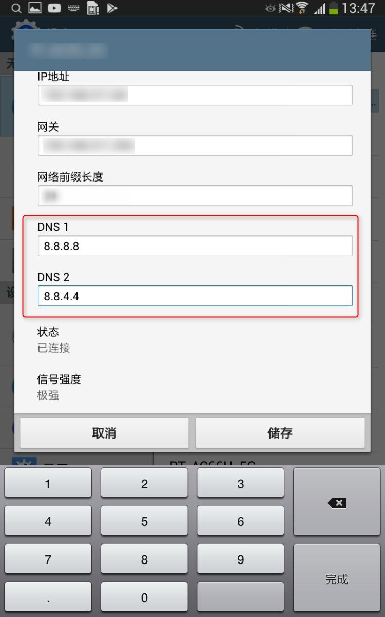 6. 将域名1 和域名2 改成需要更改的 DNS 数值本例子我们使用 8.8.8.8 和 8.8.4.4 , 然后点击 “ 保存 ” 即可